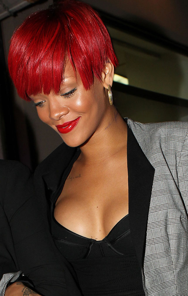 Red-headed Rihanna leaves her hotel and heads to Emilio's Ballato restaurant in Manhattan. Later in the day, Rihanna returned to the East Side Ink Tattoo salon where she reportedly had an inscription tattooed on the left side of her neck which her current beau, Matt Kemp, had helped her chose. Rihanna was carrying a Vlieger & Vandam bag with a hand gun shape emblazoned on the base of the bag.