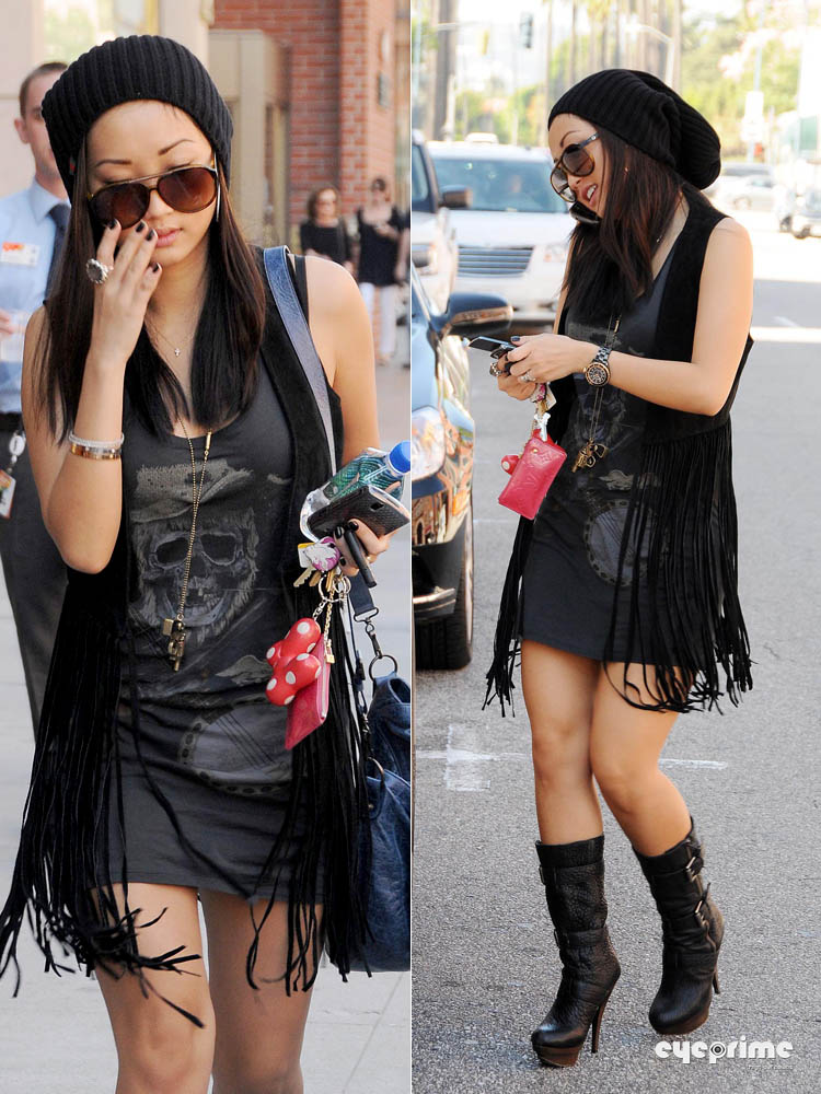 Beverly Hills, CA - Brenda Song checks her messages on her way into one her favorite spots Longmi Lashes in Beverly Hills. The Disney darling is never one to disappoint in her fashion sense, wearing a graphic skull mini dress with boots and accessorized with a long gold gun chain and matching Gucci beanie and scarf.