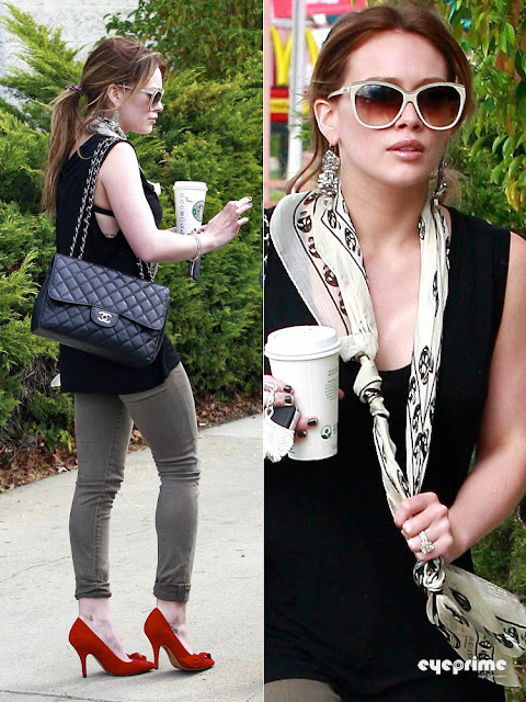 Hilary Duff heads into a medical building with bright red heels, a chanel hand bag and a drink from Starbucks in Tarzana, Encino. She's sporting a darker hair color, having dyed it a couple days ago.